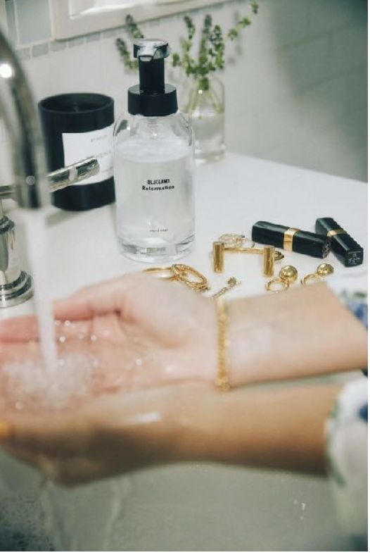 On évite d’utiliser des éponges trop abrasives et des nettoyants bijoux ou savons anti-bactériens qui peuvent contenir des composants nocifs.L'eau savonneuse est largement suffisante et très efficace !